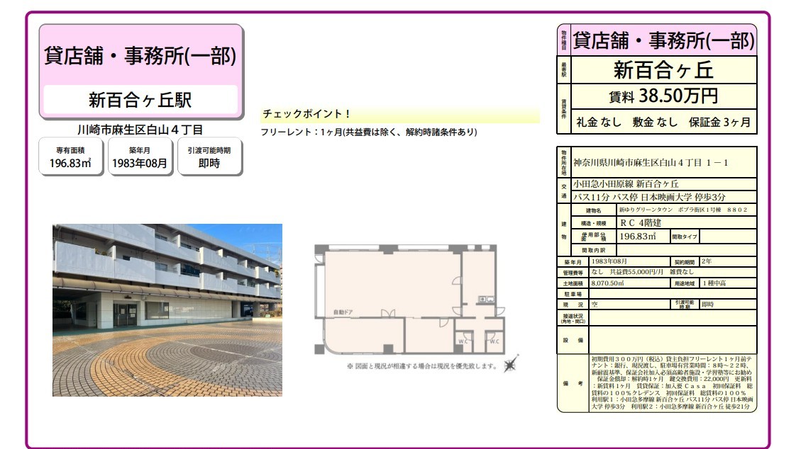 神奈川県川崎市麻生区白山4-1-1の賃貸事務所(貸事務所)・貸店舗をお探しのお客様へご案内-このたびは首都圏最大級、貸事務所・貸店舗専門ポータルサイトの神奈川オフィスMOVEをご利用いただき誠に有り難うございます。事務所移転、飲食店開業や新規独立まで賃貸事務所・賃貸オフィス・貸店舗の仲介実績豊富なスタッフがフルサポート致します。神奈川県川崎市麻生区白山4-1-1の大型駐車場付貸事務所、重飲食、美容院や居抜き店舗、レンタルオフィスまで貸事務所(賃貸事務所)、貸店舗を簡単に検索できます!神奈川県川崎市麻生区白山4-1-1でSOHO、賃貸オフィス、一棟ビルの貸事務所の貸主・オーナー様には無料にて広告掲載いたしますので是非、お問い合わせください。その他、神奈川県川崎市麻生区白山4-1-1で貸事務所・貸店舗をお探しのテナント様にはフリーレント、引越しサービスやオフィスレイアウトもアドバイス出来ますのでご相談ください。 |