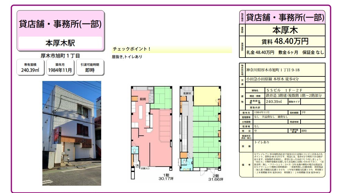神奈川県厚木市旭町1-9-18の賃貸事務所(貸事務所)・貸店舗をお探しのお客様へご案内-このたびは首都圏最大級、貸事務所・貸店舗専門ポータルサイトの神奈川オフィスMOVEをご利用いただき誠に有り難うございます。事務所移転、飲食店開業や新規独立まで賃貸事務所・賃貸オフィス・貸店舗の仲介実績豊富なスタッフがフルサポート致します。神奈川県厚木市旭町1-9-18の大型駐車場付貸事務所、重飲食、美容院や居抜き店舗、レンタルオフィスまで貸事務所(賃貸事務所)、貸店舗を簡単に検索できます!神奈川県厚木市旭町1-9-18でSOHO、賃貸オフィス、一棟ビルの貸事務所の貸主・オーナー様には無料にて広告掲載いたしますので是非、お問い合わせください。その他、神奈川県厚木市旭町1-9-18で貸事務所・貸店舗をお探しのテナント様にはフリーレント、引越しサービスやオフィスレイアウトもアドバイス出来ますのでご相談ください。 |