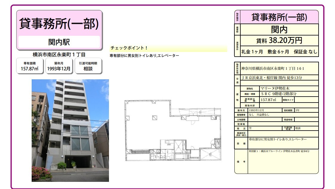 神奈川県横浜市南区永楽町1-14-1の賃貸事務所(貸事務所)・貸店舗をお探しのお客様へご案内-このたびは首都圏最大級、貸事務所・貸店舗専門ポータルサイトの神奈川オフィスMOVEをご利用いただき誠に有り難うございます。事務所移転、飲食店開業や新規独立まで賃貸事務所・賃貸オフィス・貸店舗の仲介実績豊富なスタッフがフルサポート致します。神奈川県横浜市南区永楽町1-14-1の大型駐車場付貸事務所、重飲食、美容院や居抜き店舗、レンタルオフィスまで貸事務所(賃貸事務所)、貸店舗を簡単に検索できます!神奈川県横浜市南区永楽町1-14-1でSOHO、賃貸オフィス、一棟ビルの貸事務所の貸主・オーナー様には無料にて広告掲載いたしますので是非、お問い合わせください。その他、神奈川県横浜市南区永楽町1-14-1で貸事務所・貸店舗をお探しのテナント様にはフリーレント、引越しサービスやオフィスレイアウトもアドバイス出来ますのでご相談ください。 |