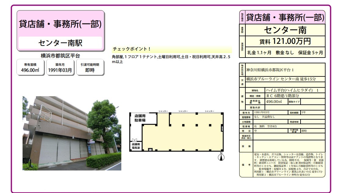 | 備考 | 角部屋1フロア1テナント土曜日利用可土日・祝日利用可天井高2.5m以上 条件交渉ご相談ください。 |