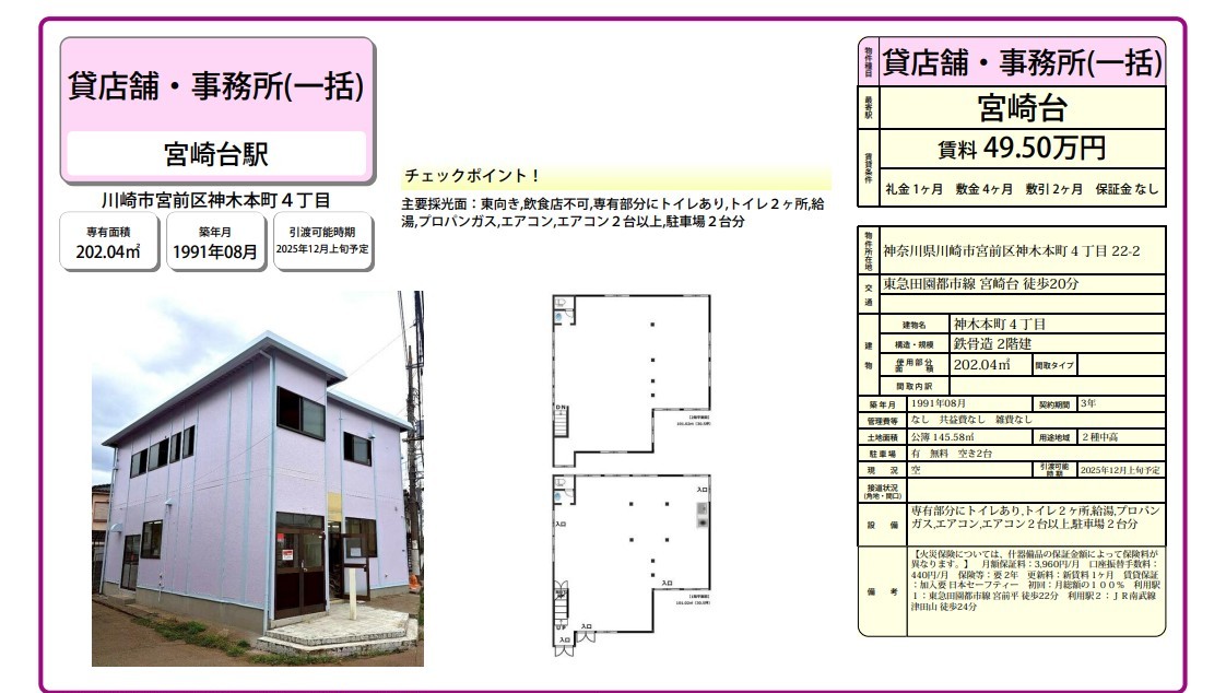 神奈川県 川崎市宮前区神木本町4-22-2の賃貸事務所(貸事務所)・貸店舗をお探しのお客様へご案内-このたびは首都圏最大級、貸事務所・貸店舗専門ポータルサイトの神奈川オフィスMOVEをご利用いただき誠に有り難うございます。事務所移転、飲食店開業や新規独立まで賃貸事務所・賃貸オフィス・貸店舗の仲介実績豊富なスタッフがフルサポート致します。神奈川県川崎市宮前区神木本町4-22-2の大型駐車場付貸事務所、重飲食、美容院や居抜き店舗、レンタルオフィスまで貸事務所(賃貸事務所)、貸店舗を簡単に検索できます!神奈川県川崎市宮前区神木本町4-22-2でSOHO、賃貸オフィス、一棟ビルの貸事務所の貸主・オーナー様には無料にて広告掲載いたしますので是非、お問い合わせください。その他、神奈川県川崎市宮前区神木本町4-22-2で貸事務所・貸店舗をお探しのテナント様にはフリーレント、引越しサービスやオフィスレイアウトもアドバイス出来ますのでご相談ください。