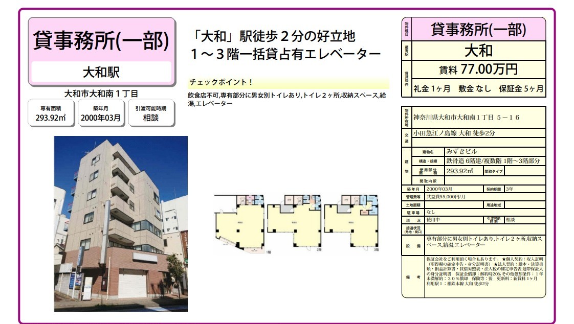 神奈川県大和市大和南1-5-16の賃貸事務所(貸事務所)・貸店舗をお探しのお客様へご案内-このたびは首都圏最大級、貸事務所・貸店舗専門ポータルサイトの神奈川オフィスMOVEをご利用いただき誠に有り難うございます。事務所移転、飲食店開業や新規独立まで賃貸事務所・賃貸オフィス・貸店舗の仲介実績豊富なスタッフがフルサポート致します。神奈川県大和市大和南1-5-16の大型駐車場付貸事務所、重飲食、美容院や居抜き店舗、レンタルオフィスまで貸事務所(賃貸事務所)、貸店舗を簡単に検索できます!神奈川県大和市大和南1-5-16でSOHO、賃貸オフィス、一棟ビルの貸事務所の貸主・オーナー様には無料にて広告掲載いたしますので是非、お問い合わせください。その他、神奈川県大和市大和南1-5-16で貸事務所・貸店舗をお探しのテナント様にはフリーレント、引越しサービスやオフィスレイアウトもアドバイス出来ますのでご相談ください。 |