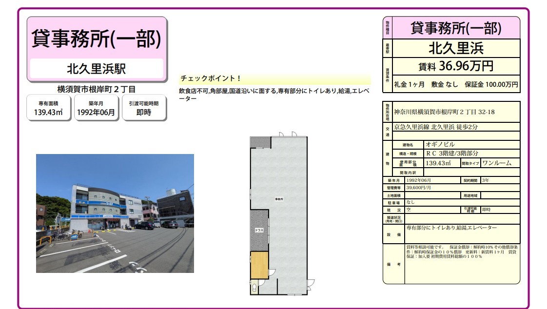 神奈川県横須賀市根岸町2-32-18の賃貸事務所(貸事務所)・貸店舗をお探しのお客様へご案内-このたびは首都圏最大級、貸事務所・貸店舗専門ポータルサイトの神奈川オフィスMOVEをご利用いただき誠に有り難うございます。事務所移転、飲食店開業や新規独立まで賃貸事務所・賃貸オフィス・貸店舗の仲介実績豊富なスタッフがフルサポート致します。神奈川県横須賀市根岸町2-32-18の大型駐車場付貸事務所、重飲食、美容院や居抜き店舗、レンタルオフィスまで貸事務所(賃貸事務所)、貸店舗を簡単に検索できます!神奈川県横須賀市根岸町2-32-18でSOHO、賃貸オフィス、一棟ビルの貸事務所の貸主・オーナー様には無料にて広告掲載いたしますので是非、お問い合わせください。その他、神奈川県横須賀市根岸町2-32-18で貸事務所・貸店舗をお探しのテナント様にはフリーレント、引越しサービスやオフィスレイアウトもアドバイス出来ますのでご相談ください。 |