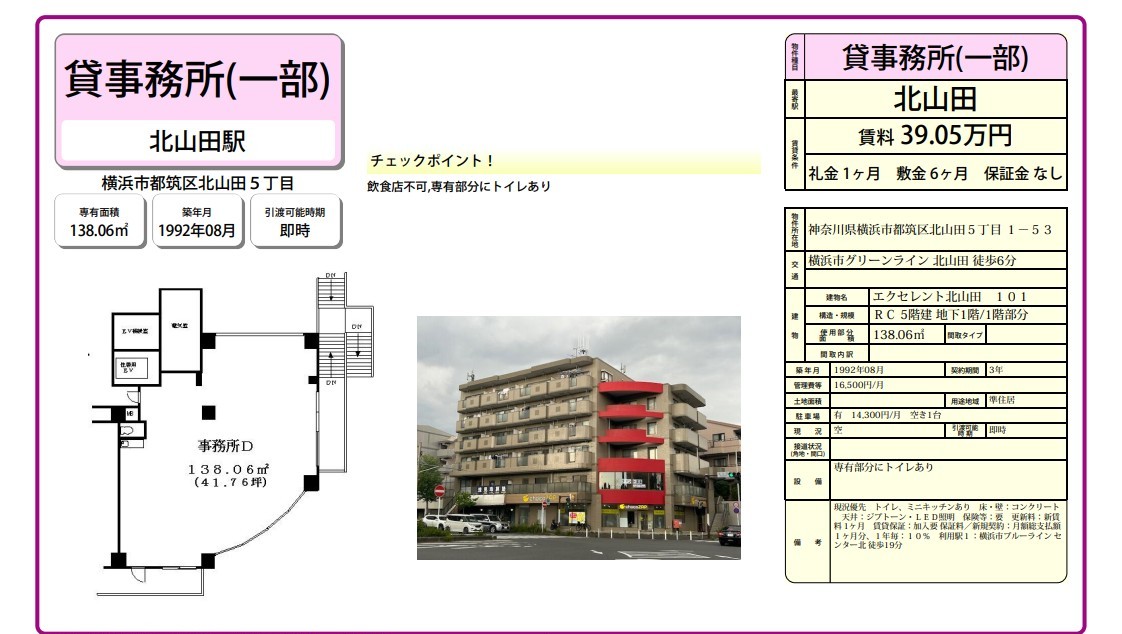 神奈川県横浜市都筑区北山田5-1-53の賃貸事務所(貸事務所)・貸店舗をお探しのお客様へご案内-このたびは首都圏最大級、貸事務所・貸店舗専門ポータルサイトの神奈川オフィスMOVEをご利用いただき誠に有り難うございます。事務所移転、飲食店開業や新規独立まで賃貸事務所・賃貸オフィス・貸店舗の仲介実績豊富なスタッフがフルサポート致します。神奈川県横浜市都筑区北山田5-1-53の大型駐車場付貸事務所、重飲食、美容院や居抜き店舗、レンタルオフィスまで貸事務所(賃貸事務所)、貸店舗を簡単に検索できます!神奈川県横浜市都筑区北山田5-1-53でSOHO、賃貸オフィス、一棟ビルの貸事務所の貸主・オーナー様には無料にて広告掲載いたしますので是非、お問い合わせください。その他、神奈川県横浜市都筑区北山田5-1-53で貸事務所・貸店舗をお探しのテナント様にはフリーレント、引越しサービスやオフィスレイアウトもアドバイス出来ますのでご相談ください。 |