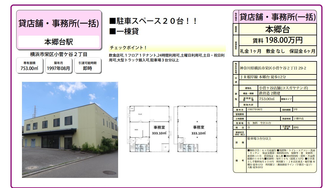 神奈川県横浜市栄区小菅ケ谷2-29-2の賃貸事務所(貸事務所)・貸店舗をお探しのお客様へご案内-このたびは首都圏最大級、貸事務所・貸店舗専門ポータルサイトの神奈川オフィスMOVEをご利用いただき誠に有り難うございます。事務所移転、飲食店開業や新規独立まで賃貸事務所・賃貸オフィス・貸店舗の仲介実績豊富なスタッフがフルサポート致します。神奈川県横浜市栄区小菅ケ谷2-29-2の大型駐車場付貸事務所、重飲食、美容院や居抜き店舗、レンタルオフィスまで貸事務所(賃貸事務所)、貸店舗を簡単に検索できます!神奈川県横浜市栄区小菅ケ谷2-29-2でSOHO、賃貸オフィス、一棟ビルの貸事務所の貸主・オーナー様には無料にて広告掲載いたしますので是非、お問い合わせください。その他、神奈川県横浜市栄区小菅ケ谷2-29-2で貸事務所・貸店舗をお探しのテナント様にはフリーレント、引越しサービスやオフィスレイアウトもアドバイス出来ますのでご相談ください。 |